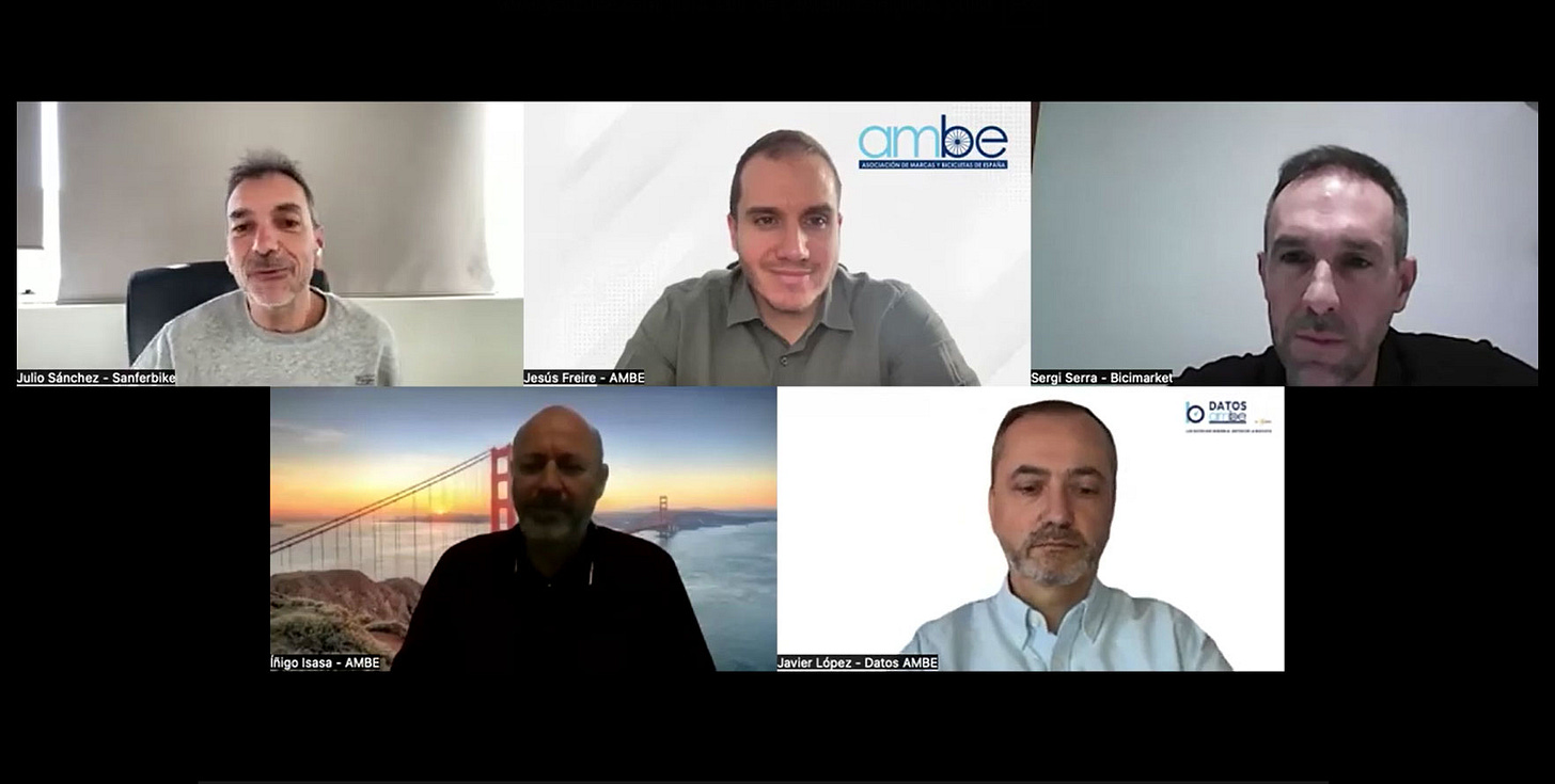 El encuentro estuvo presentado y moderado por Jesús Freire, secretario general de AMBE, junto a Iñigo Isasa, presidente de la asociación. En el panel participaron Julio Sánchez (Sanferbike), Sergi Serra (Bicimarket) y Javier López (Datos AMBE).