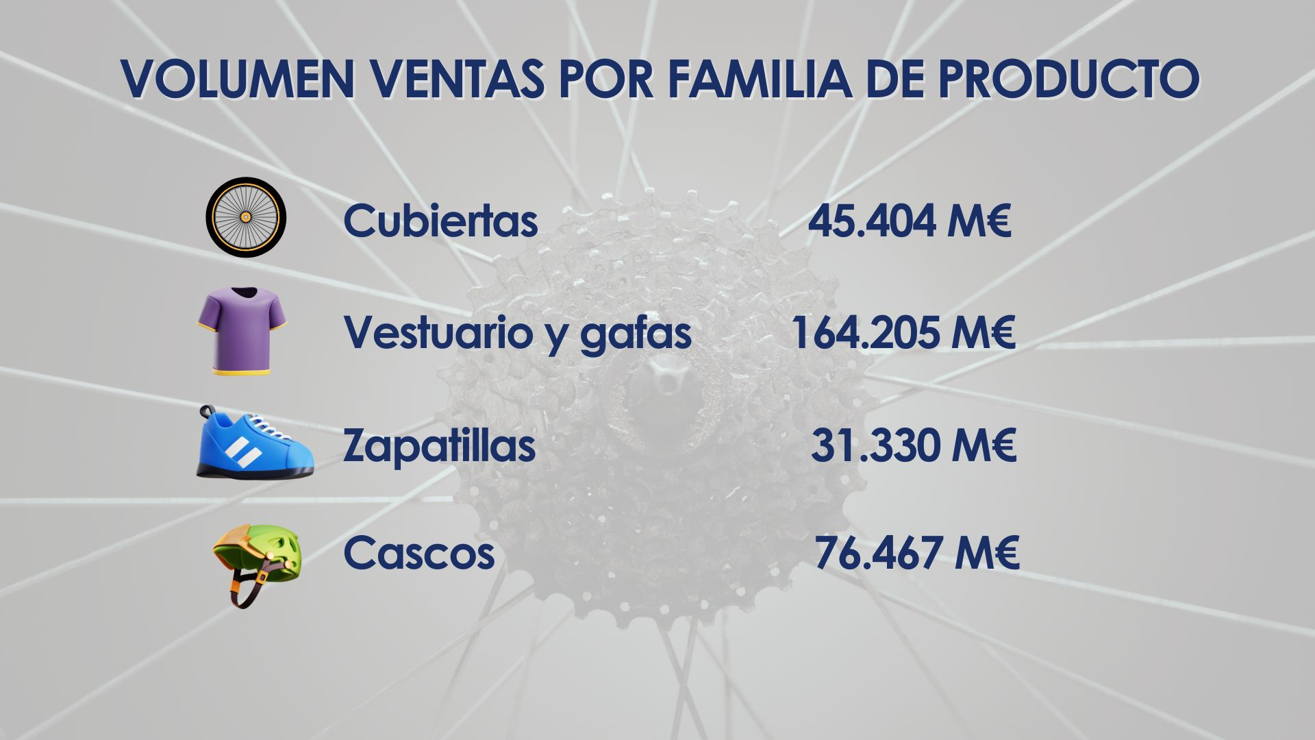 El mercado de componentes y accesorios mantuvo una demanda relativamente sólida. En facturación destacaron vestuario y gafas, seguidos de cascos y cubiertas, mientras que en unidades sobresalieron transmisiones, frenos y cubiertas, reflejando la importancia creciente del mantenimiento y la reposición en un contexto de renovación más lenta del parque ciclista.