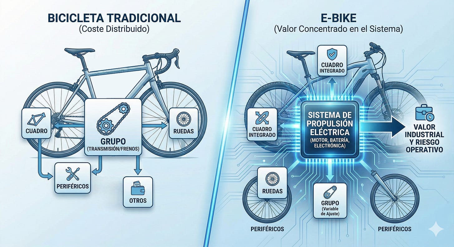 La electrificación ha cambiado la economía de la bicicleta: en la e-bike, el sistema eléctrico concentra el valor y redefine los costes.