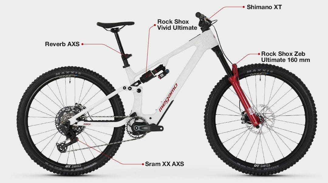 El modelo incorpora un conjunto de suspensiones Rock Shox de gama alta, con horquilla Zeb Ultimate y amortiguador Vivid Ultimate, ambos con 160 mm de recorrido. En transmisión, equipa un grupo Sram XX AXS T-Type de 12 velocidades, mientras que el sistema de frenado corre a cargo de Shimano XT.