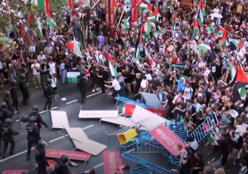 Durante la última etapa de La Vuelta a España 2025 en Madrid, protestas propalestinas en contra de la participación del equipo Israel-Premier Tech obligaron a suspender la jornada apenas a unos kilómetros del final. Las manifestaciones contra lo que la ONU ha calificado como actos de genocidio por parte del Estado de Israel incluyeron bloqueos en carreteras y la invasión de parte del recorrido, lo que puso en riesgo la seguridad de ciclistas, espectadores y del propio equipo organizador.