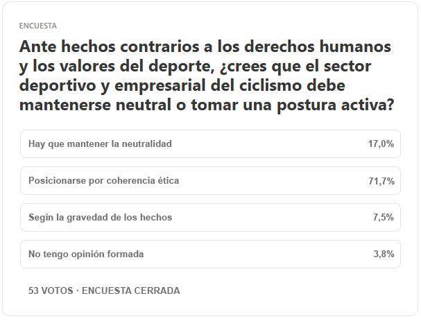 En medio de un debate cargado de sensibilidades, perspectivas y contradicciones, lo cierto es que el ciclismo confirma, una vez más, su condición de escaparate global en el que se reflejan no solo los valores del deporte, sino también las tensiones de nuestro tiempo.