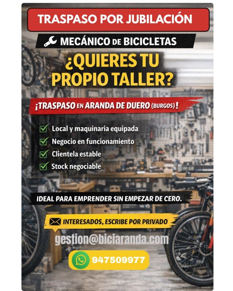 Traspaso por jubilación taller y tienda de bicicletasTraspaso por jubilación taller y tienda de bicicletas en Aranda de Duero (Burgos).Redacciónfeb 27, 2026CompartirSuscríbete Gratis a Bikebusiness.es y no te pierdas la actualidad del sector.Suscribirse